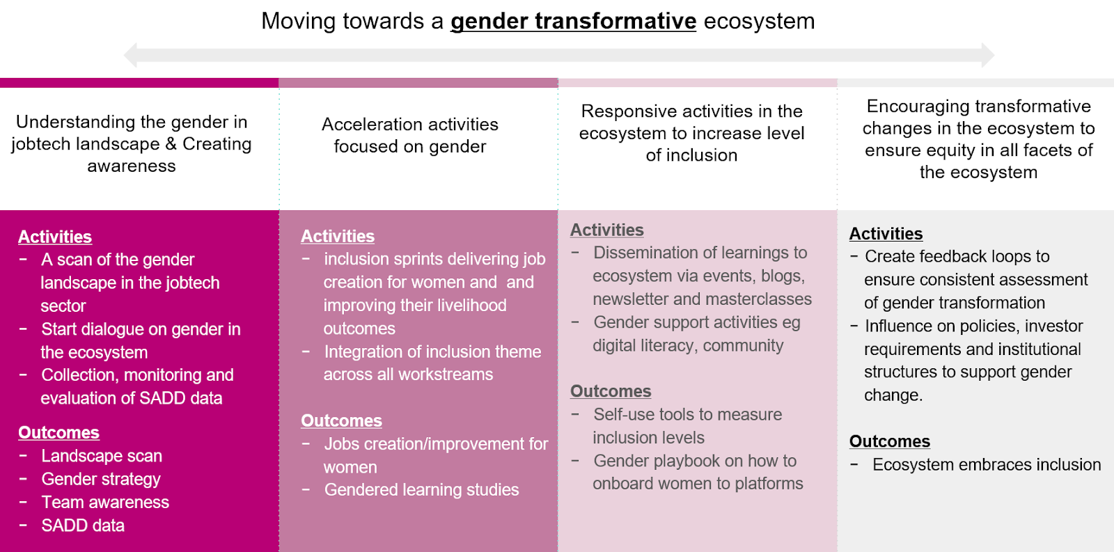 Jobtech Alliance’s gender strategy recognises that creating an inclusive jobtech ecosystem happens in phases, starting with building a basic understanding & awareness about the gender in jobtech landscape, then undertaking acceleration activities focused on gender to demonstrate what is possible, while catalyzing responsive activities in the ecosystem to increase the level of inclusion, and encouraging transformative changes in the ecosystem to ensure equity.